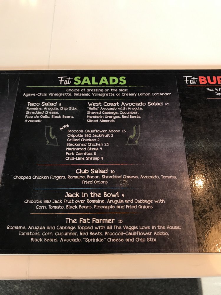 pork carnitas topped with melted jack/cheddar, fat `N fluffy rice, fried pickles, smoked bacon, roasted corn, fries, lettuce, salsa fresca and fat sauce.