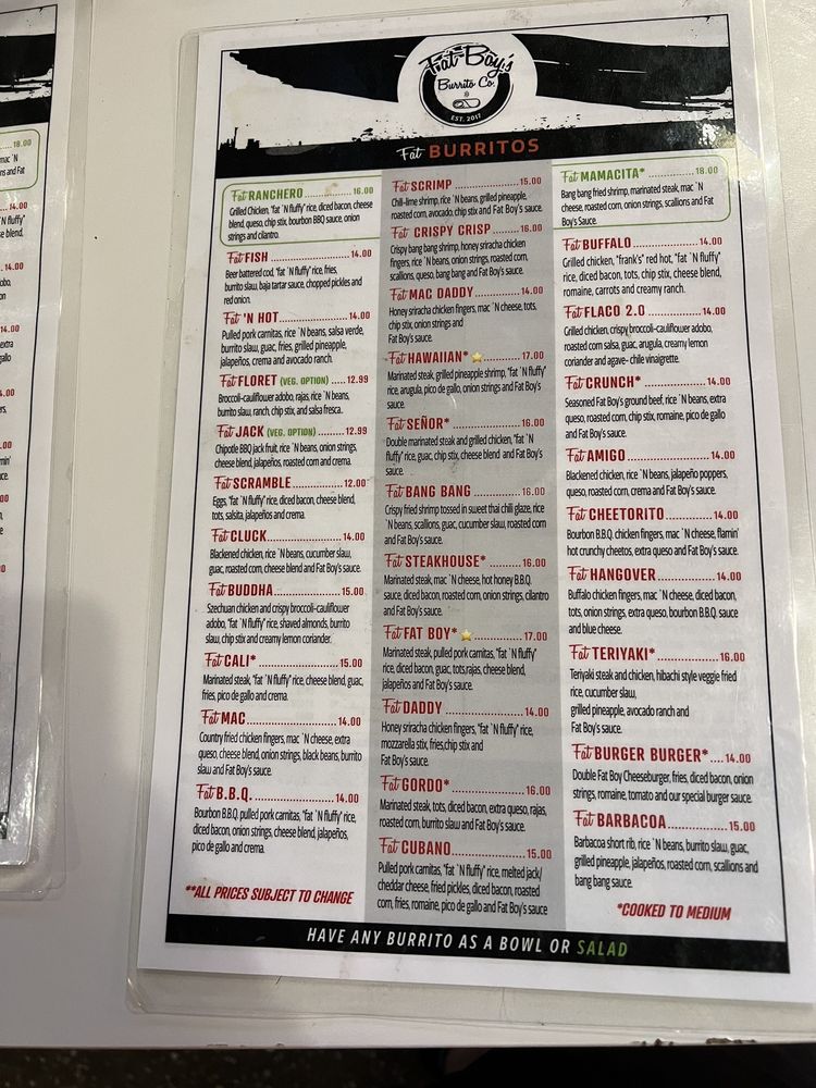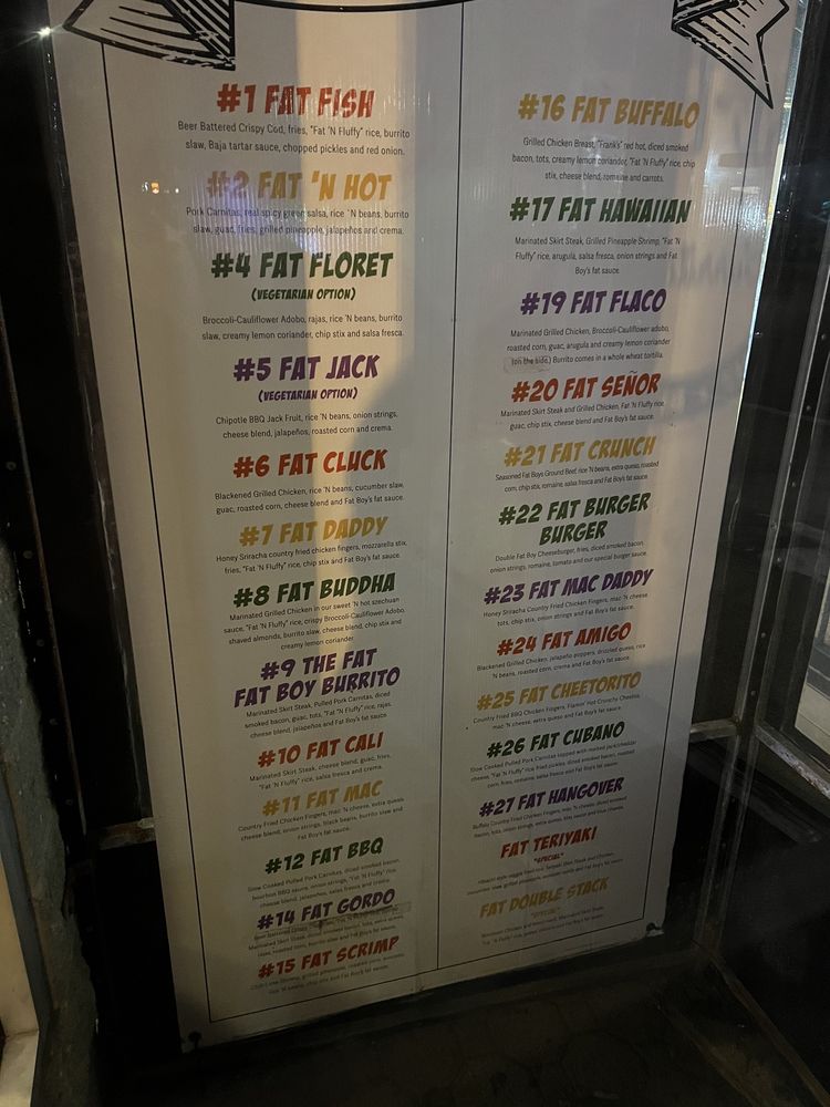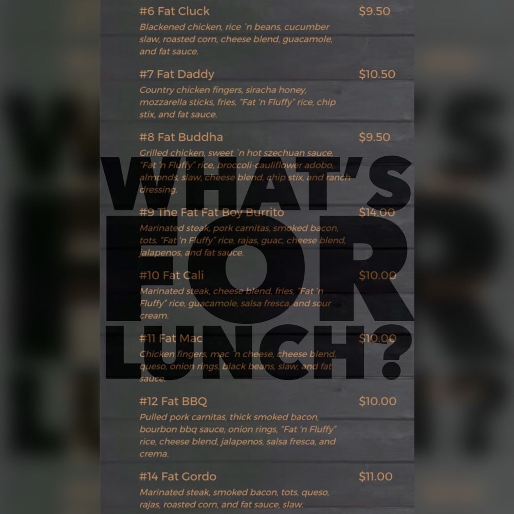 Seasoned fat boys beef, fat'n fluffy rice, queso gordo, black beans, roasted corn, chip stix, shredded lettuce, pico de gallo, topped with fat sauce in a crispy, crunchy burrito